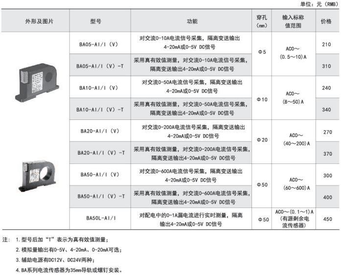 BA50-AI/I(V) | 對交流0-600A電流信號采集,隔離變送輸出4-20mA或0-5V DC信號 | Φ50 | AC0~(60~600)A |