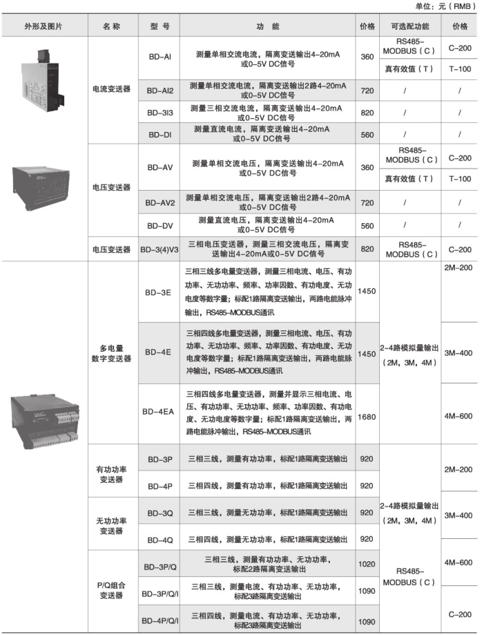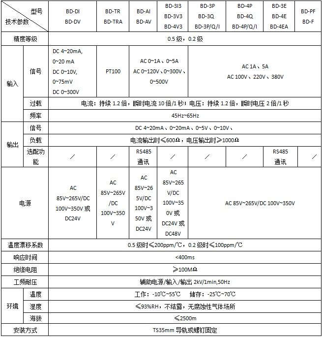 功率因素變送器 | BD-PF | 測量單、三相系統的功率因數,隔離變換成直流信號輸出 | RS485-MODBUS |