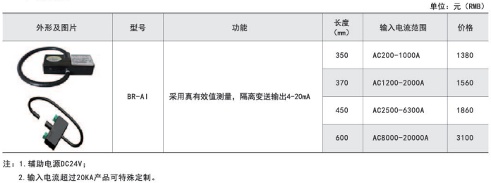 BR-AI | 采用真有效值測(cè)量, 隔離變送輸出4-20mA | 350 | AC200-1000A |