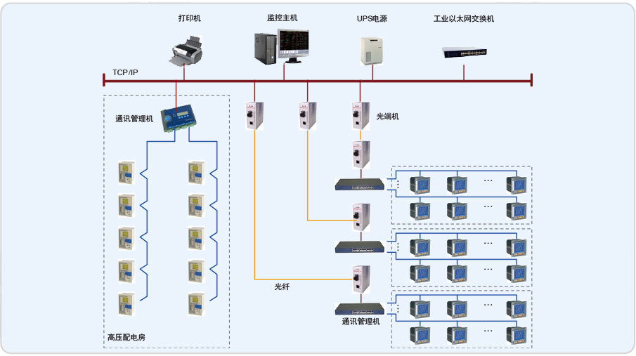 系統(tǒng)采用分層分布式結(jié)構(gòu),在高壓配電房設(shè)置一臺(tái)4口的通訊管理機(jī),采用RS485總線將網(wǎng)絡(luò)儀表接入通訊管理機(jī),直接與交換機(jī)相連,進(jìn)行數(shù)據(jù)上傳;在每個(gè)低壓配電室設(shè)置一臺(tái)16口通訊管理機(jī),采用RS485總線將網(wǎng)絡(luò)儀表接入通訊管理機(jī),再通過(guò)光纖傳輸,將采集的所有現(xiàn)場(chǎng)設(shè)備的數(shù)據(jù)傳至監(jiān)控主機(jī),實(shí)現(xiàn)遠(yuǎn)程電參量實(shí)時(shí)監(jiān)測(cè)。