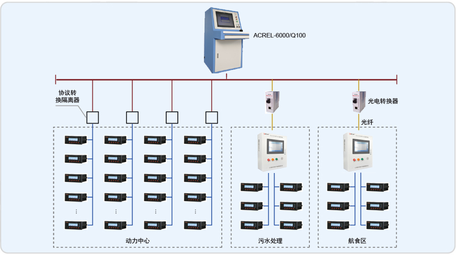 系統(tǒng)采用分層分布式結(jié)構(gòu),站控管理層及現(xiàn)場設(shè)備層,站控管理層設(shè)備為我公司一套琴臺式電氣火災(zāi)監(jiān)控設(shè)備及2套壁掛式電氣火災(zāi)監(jiān)控設(shè)備,對分散在各區(qū)域內(nèi)的ARCM剩余電流式電氣火災(zāi)監(jiān)控裝置進(jìn)行遙測、遙信,實(shí)現(xiàn)監(jiān)控與管理。各區(qū)域內(nèi)探測器采用RS485總線直接接入琴臺式電氣火災(zāi)監(jiān)控設(shè)備。系統(tǒng)采用Acrel-6000電氣火災(zāi)監(jiān)控系統(tǒng),實(shí)現(xiàn)對被保護(hù)電氣線路的實(shí)時(shí)監(jiān)測。
