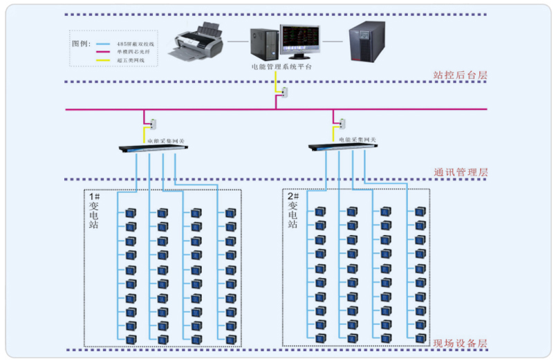 本項(xiàng)目主要是針對(duì)海南昌建逸海國(guó)際廣場(chǎng)內(nèi)的10KV/0.4KV的1#,2#變電所設(shè)計(jì)一套電力監(jiān)控系統(tǒng)。主要是采集10kV多功能網(wǎng)絡(luò)儀表電力參數(shù)、開(kāi)關(guān)帶電指示儀開(kāi)關(guān)狀態(tài)及0.4kV變電站多功能儀表的電參量,現(xiàn)場(chǎng)智能表計(jì)采用RS485總線(xiàn)組網(wǎng)接入電能管理系統(tǒng),系統(tǒng)主機(jī)安裝在1#變電所內(nèi)。